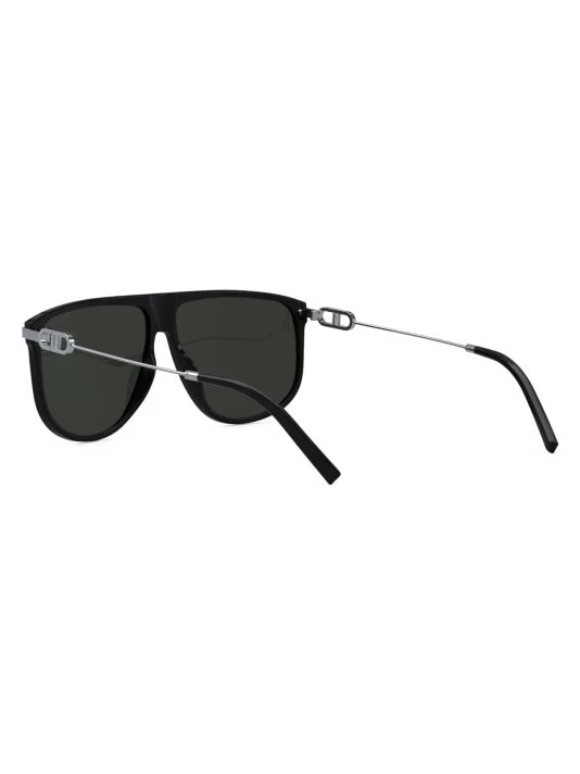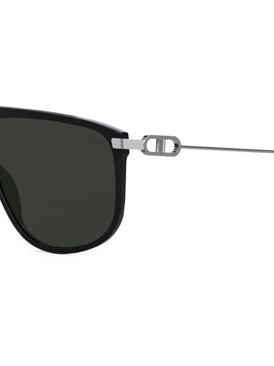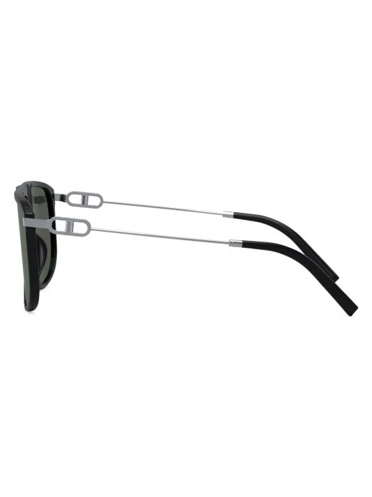 Square shiny black acetate sunglasses with thin guilloché on temples and solid khaki lenses.