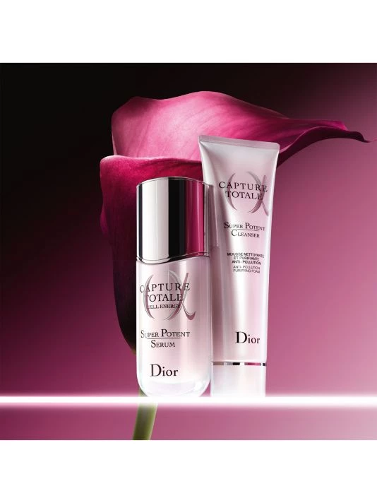 The Capture Totale foam removes 85%* of a high SPF product. Even the finest particles are eliminated. The skin’s hydration is maintained for 6 hours** to prevent feelings of tightness. * Instrumental test on 16 volunteers, with Dior Bronze Face Creme SPF 50. ** Instrumental test on 11 women. A cream texture that transforms into an ultra-comfortable foam upon contact with the skin. After 4 weeks of using Super Potent Cleanser alone, women find their skin seems more beautiful: radiance, vitality and refined texture. After 28 days of using Super Potent Cleanser and Super Potent Serum, the quality of the skin appears revived: Skin firmness: +29%*, Skin vitality: +48%*, Skin softness: +52%*, Skin radiance: +57%*, Skin evenness: +41%*, Skin hydration: +56%*. * Half-face clinical assessment by a dermatologist on 29 women.