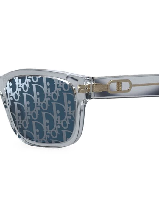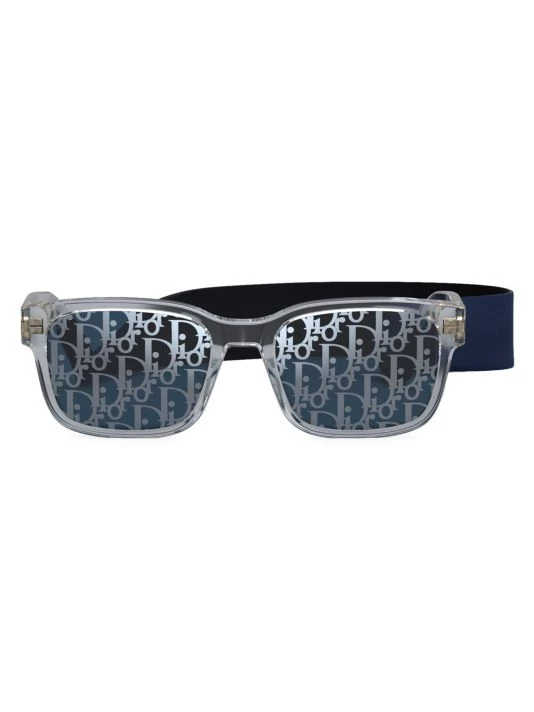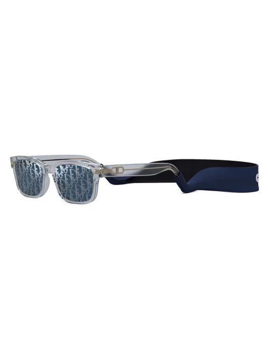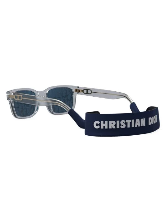 The CD Link rectangular shiny crystal acetate sunglasses feature visible metal corewire through transparent acetate temples, a dedicated neoprene strap and solid blue Dior Oblique lenses.