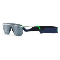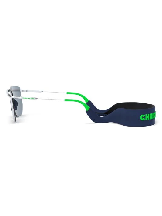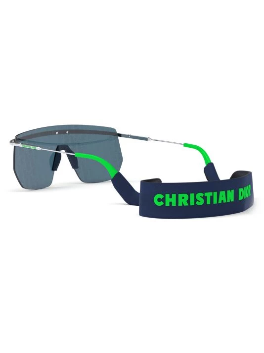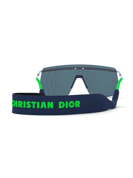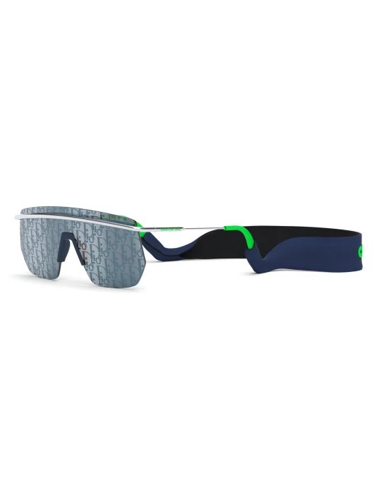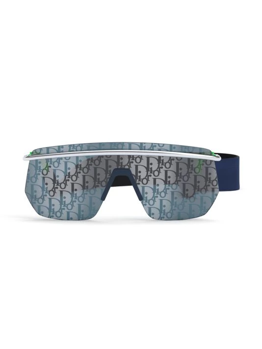 These futuristic frames flaunt mirrored lenses etched with Dior’s oblique logo pattern and a sporty strap with neon logo accents.