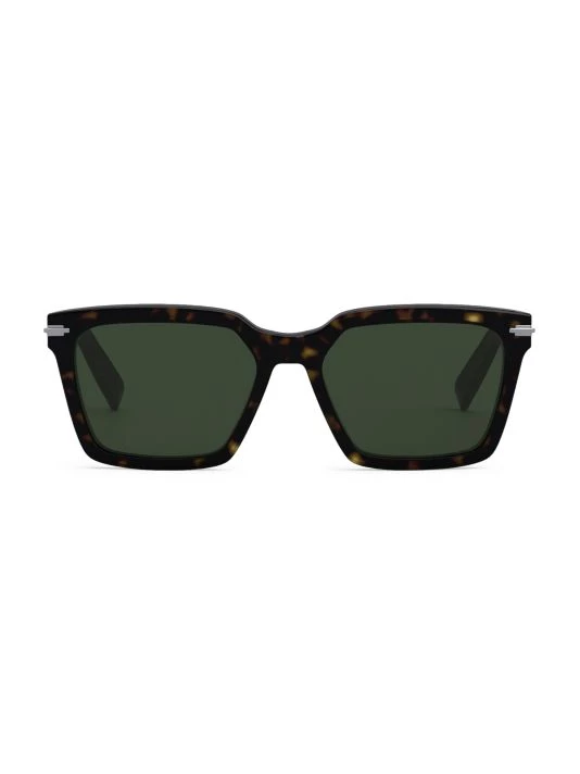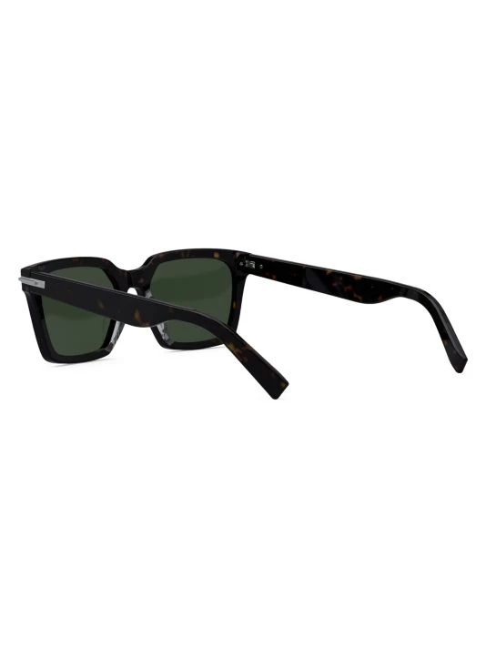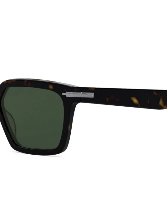 Rectangular polished sunglasses with solid lenses featuring metal hardware at hinges with etched logo.