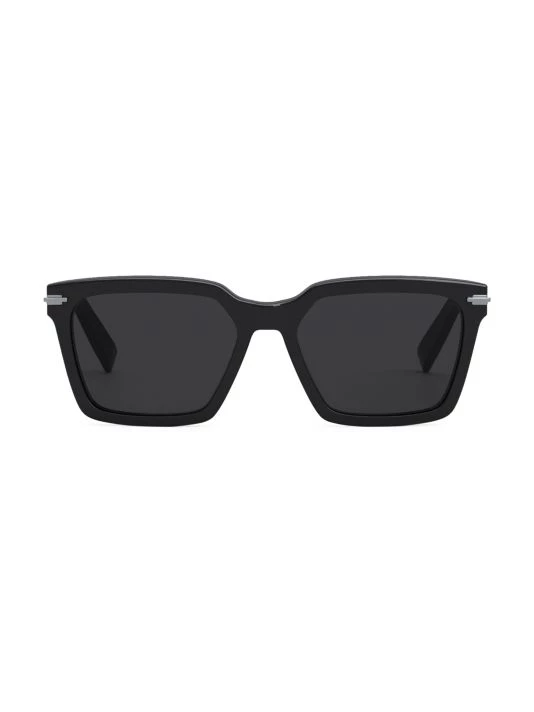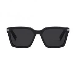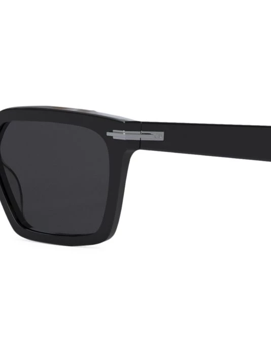 Rectangular shiny black acetate sunglasses with solid grey polarized lenses.