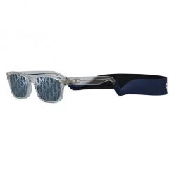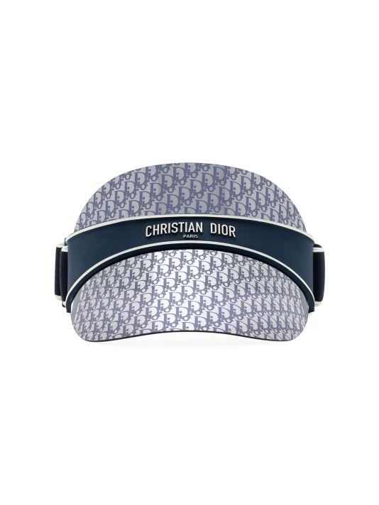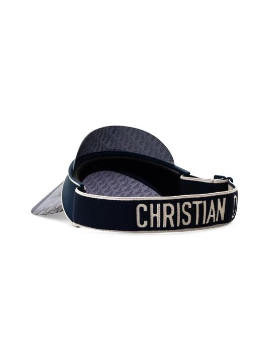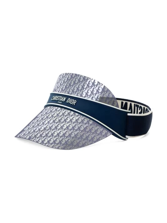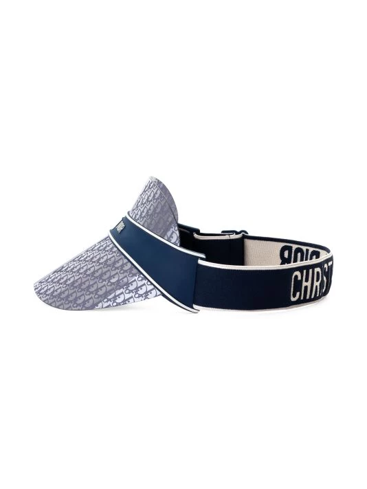 The DiorClub V1U visor is distinguished by its innovative design and whimsical sportswear look. The white ‘CHRISTIAN DIOR PARIS’ signature subtly contrasts with the navy blue matte structure, echoing the jacquard stretch band. The design, completed by a blue visor with a silver mirrored Dior Oblique motif, is a statement piece with a resolutely Dior style.