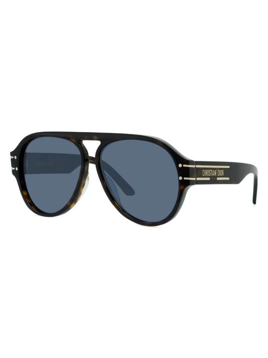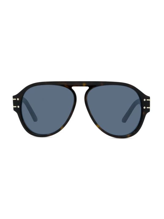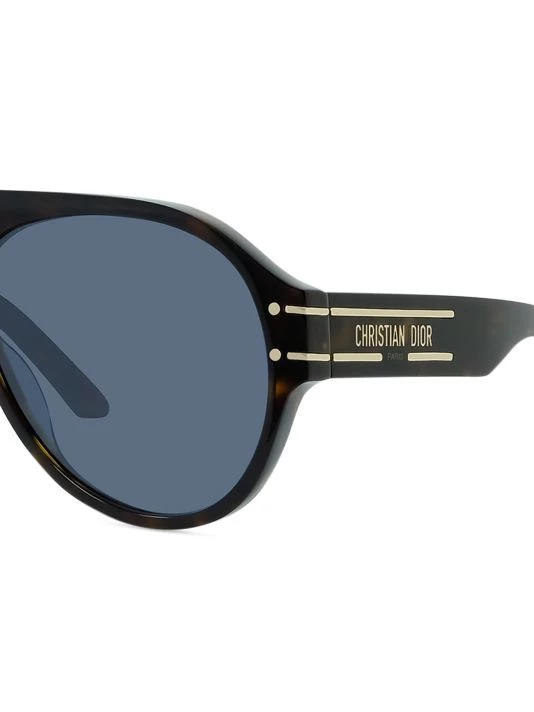 Diorsignature line is fully inspired by the iconic oui ring of maison Dior. The logo Dior in metal on a temple recalls the handwriting of Christian Dior, giving a twist to these timeless and elegant glasses. Pilot shiny classic havana acetate sunglasses with gold metal dots and lines in relief on the front and gradient smoke lenses.