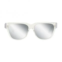 Rectangular sunglasses in a shiny crystal finish with mirrored silver lenses.